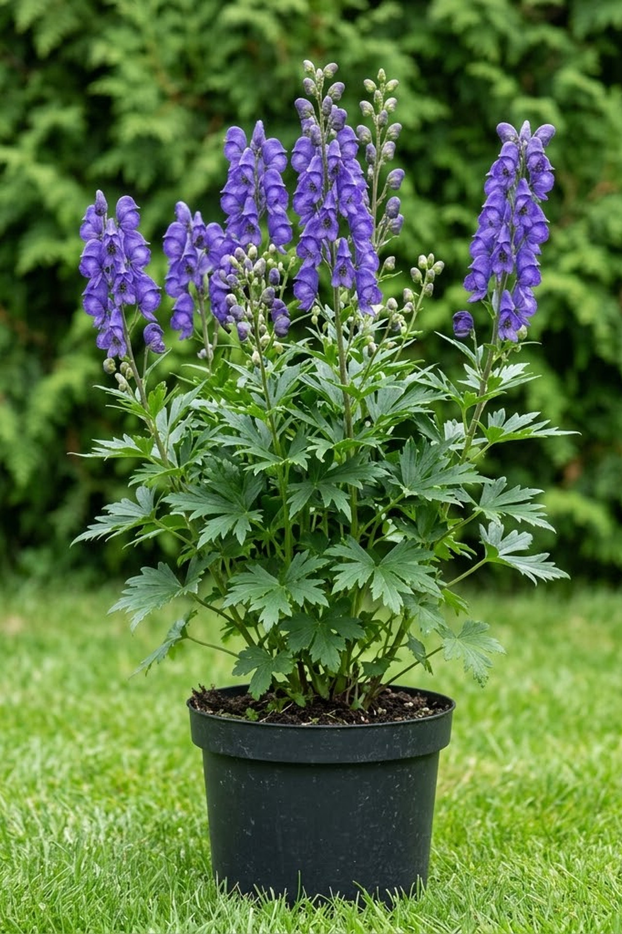 Высокорослый куст с мощным клубневидным корневищем, темно зеленые блестящие листья пальчато рассечены, высокие рыхлые соцветия образованы крупными цветами в форме шлема, цветки темно синие, цветет с сентября по октябрь, любит почвы богатые питательными веществами, среднетяжелые, любит солнце и полутень