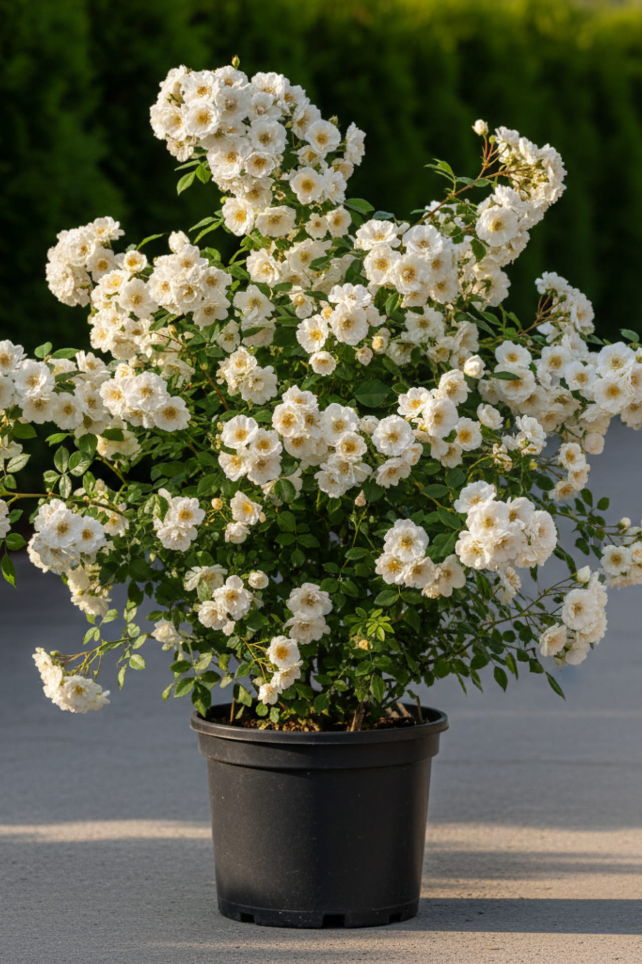 очень сильнорослый, высотой от 3 до 7 м, обильно укрыт крупной ярко-зеленой блестящей листвой. Цветет один раз, на побегах второго года, но очень обильно, так что под цветами не видно листьев. Цветки раскрываются медленно, в течение двух недель. Может нарастать несколько лет, прежде чем зацветет первый раз.Аккуратные белые, полумахровые цветки 4,5 см в диаметре появляются в крупных густых щитковидных соцветиях по 5-15 штук из заостренных, зеленоватых с оттенком розового бутонов. В центре цветка расположен пучок золотых тычинок, цветки сильно пахнут мускусом.