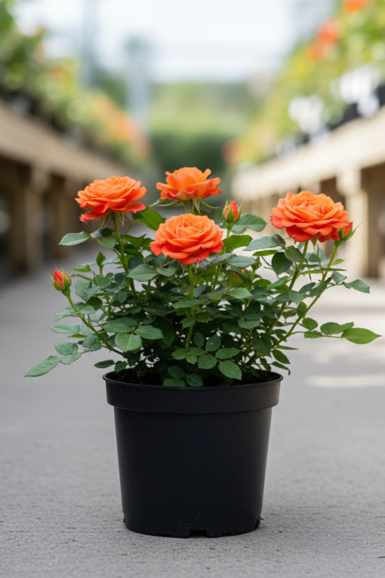 Роза с красно-оранжевыми махровыми цветками, собранными в соцветия. Побеги ветвистые, с мелкими зелёными листочками.